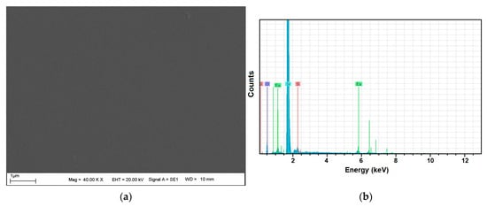 Figure 1a provides an in-depth SEM image of the surface characteristics of the 50 nm EuS thin film. Upon meticulous examination, it becomes clear that the surface presents a uniform and exceptionally smooth texture. It is worth highlighting that there is a conspicuous absence of any observable signs of segregation or irregular distribution of EuS material on the Si/SiO2 substrate, thereby signifying the presence of a homogenous and firmly adhered thin film structure. The EDX spectrum that corresponds to the 50 nm thin film specimen is shown in Figure 2, rendering invaluable insights into its elemental composition. This spectral analysis unveils distinctive and prominent peaks that unambiguously signify the presence of both Eu and S elements within the thin film. Additionally, it is imperative to underscore that the spectrum also exhibits supplementary peaks originating from the Si/SiO2 substrate.