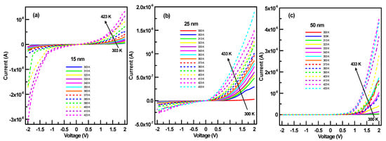 The I–V characteristics, shown in Figure 2a–c, provide a comprehensive view of how the electrical behavior of the three samples varies with changes in film thickness and temperature. Conspicuously, each of the three samples displays unique responses in the IV curve as a function of both film thickness and temperature.
