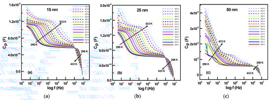 To obtain a better understanding of the behavior, capacitance-frequency (Cp-f) measurements were made. Figure 3 shows the capacitance frequency dependence Cp-f graphs for every sample at various temperatures. The behavior for all thicknesses is the same. Initially, the capacitance increases with increasing temperature from 1 Hz up to 106 Hz, then capacity reduces as temperature increases as frequency exceeds 106. Since this frequency-dependent behavior of capacitance values occurs at low frequencies, the measurement system can detect the movements of the loads in the traps, and the signal period applied at high frequencies may be shorter than the lifespan of the loads in the traps [,].