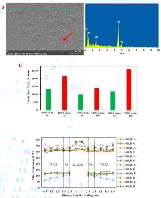 When compared to FSW between alumnium and titanium, FSSW of Al to Ti has not received the same attention. Limited studies have been published in the open literature. Nasir et al. [28] investigated the FSSW of AA7075-T651 to Ti-6Al-4V alloys using a carbon fiber-reinforced polymer (CFRP) as an interlayer material. The effect of welding parameters and the presence of the interlayer material was investigated. The results showed an increment in the shear tensile strength (maximum) that was due to the heat input that melted the carbon fiber-reinforced polymer interlayer material and resulted in the enhancement of the formed bond between the materials. They also indicated that the dwell time has a significant effect on the shear tensile load (Figure 2b). However, the hardness values were principally affected by the tool rotational speed as depicted in Figure 2c. The SEM/EDS analysis showed the presence of intermetallic compounds (Ti3Al and Ti-Al-C), which were found to impact the shear tensile strength of the fabricated joints (Figure 2a). The formation of intermetallics depended on the heat cycle of a weld joint, which was linked to the process parameters utilized, namely rotational speed and dwell time [28].