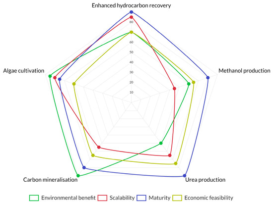In this section, we compare five different CO2 utilization methods in terms of their environmental benefits, scalability, maturity, and economic feasibility in the context of Uzbekistan, without specific metrics. Taking into account the various aspects and criteria for each unique situation and technology presents challenges in achieving a precise comparison. Therefore, this discussion aims to offer a broader understanding of the feasibility of each approach. Figure 2 represents a comparison of the CO2 utilization pathways in Uzbekistan based on four different parameters.