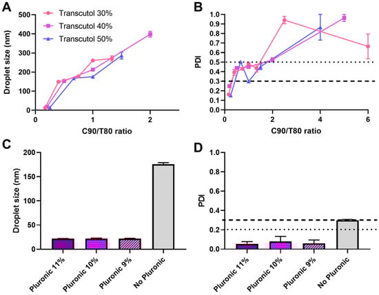 Droplet size (A) and PDI (B) variation with different Capryol 90 (C90) to Tween 80 (T80) ratios, at 30, 40 and 50% Transcutol (percentage in emulsion preconcentrate); Effect of Pluronic addition, at different concentrations, to a preliminary nanoemulsion, in droplet size (C) and PDI (D) values.