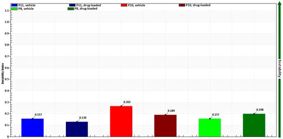 Instability indexes in accelerated stability studies of nanoemulgels with 11 (P11), 10 (P10) or 8% (P8) Pluronic, encapsulating ketoprofen (drug-loaded) or not (vehicle).