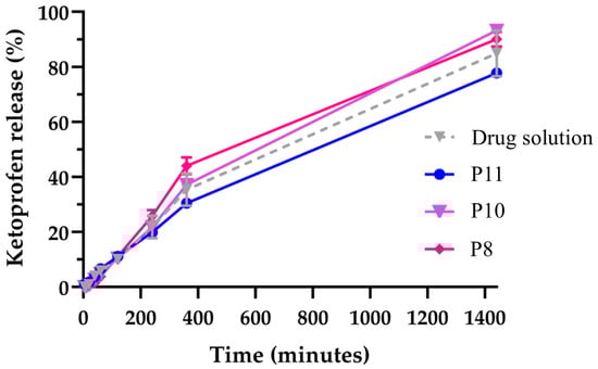 In vitro drug release percentage (cumulative release) of nanoemulgels P11 (11% Pluronic), P10 (10% Pluronic) and P8 (8% Pluronic), containing Capryol 90, Tween 80, Transcutol and ketoprofen, and positive control (drug solution, with ketoprofen dissolved in Transcutol) for 24 h (1440 min).