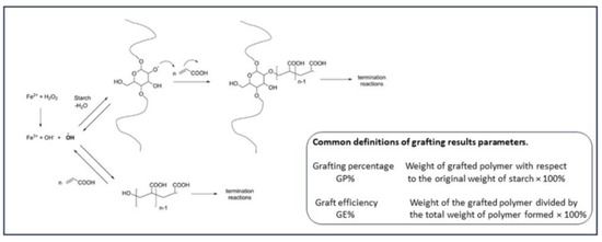 The scheme of Figure 1 shows the important reaction steps. From this scheme, it is obvious that reactions towards homopolymer are intrinsic to the type of starch activation via radicals produced in the solution, as is the case with Fenton’s reagent. How many of the OH radicals react with starch or with monomer is a matter of chance and probability. This is dependent on various reaction conditions and thus can be influenced, as will be discussed further on. The result of the grafting process is usually expressed with the parameters GP and GE, defined in Figure 1.