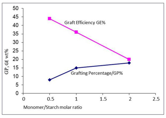 The relative concentrations of monomer and starch, the M/S molar ratio, are other important factors. With Fenton’s initiator we have seen an opposite effect of the M/S ratio, which is shown in Figure 2 [4]. Such an effect is reported in other literature sources as well, e.g., [7,8]. At a higher dosage of monomer, there can be more and longer grafts, hence a higher GP. But with lots of monomer in the system, there is also a higher chance that monomer molecules will be activated towards homopolymerization. This means that the ratio of monomer to starch must be low to achieve good GE—but this will be at the cost of a lower amount of functional new polymer groups. So, the optimal value here will be a trade-off.