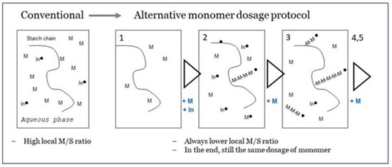 Most grafting research with starch has been carried out with water as the main solvent. However, the impact of the factor of water solubility of the monomer is almost never addressed in the literature, probably because most researchers work with one single monomer. In the graft copolymerization of methyl methacrylate, graft selectivity results in the order of 90% or better are reported, e.g., in [3,6,9]. Also, with acrylonitrile [3,10] or styrene [11], comparable good graft selectivity has been reported. The common factor between these monomers is that they are poorly water soluble, up to hydrophobic. Those selectivity results are in sharp contrast to results for acrylamide and acrylic acid monomers, where GE is usually lower, even in the order of only 20–30% [2,4,10,12]. These reagents are water soluble and hydrophilic.
