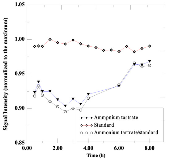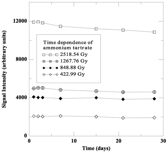 The time-dependence curves of HPP for both the standard and ammonium tartrate dosimeters are shown in Figure 3, where it is clear that the instabilities of the peak-to-peak signal amplitude of the ammonium tartrate over the first eight hours following irradiation cannot be attributed to changes in the spectrometer sensitivity, as can be confirmed with the behavior of the standard. During the first hour, variations in HPP were in the range of 0.74% and the average value showed instabilities, while during the next 3 h, the HPP decreased, while the variation range was about 0.68%. After the 4th hour, the HPP started to increase markedly, with a variation range of 1.39%; this behavior is partially different from in other previous studies [17,20] and suggests the presence of more than one radical species.