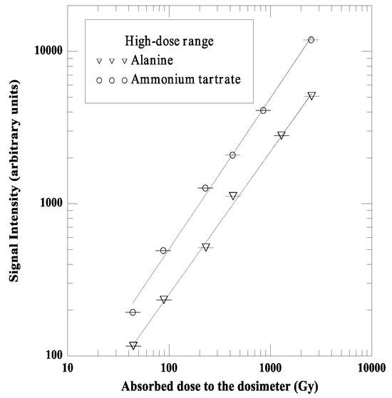 Responses of HPP to radiation doses in the range of (1.5–88) Gy for both alanine and ammonium tartrate.