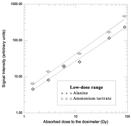 Figure 5 represents the responses of ammonium tartrate and alanine dosimeters to the same radiation doses in the range of (44–250) Gy, and both have been fitted linearly. From the figure, it is clear that ammonium tartrate is more sensitive than alanine by a factor (on average) of about 2.1. The responses to a low radiation dose range, (1.5–78) Gy, are represented and linearly fitted in Figure 6; the ammonium tartrate dosimeters were found to be more sensitive than the alanine by a factor of 1.84 on average.