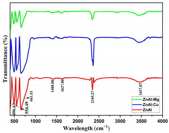 FT-IR spectra of ZnAl, ZnAl:Cu and ZnAl:Mg.