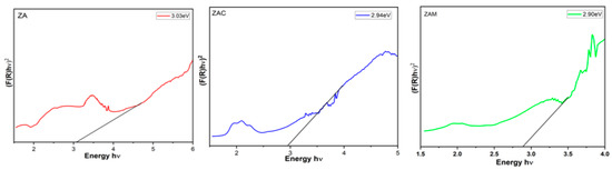 where α is the absorption coefficient, hν is the photon energy, A is a constant depending on the type of transition and n is the coefficient of allowed transitions. For the direct band gap, , and for the indirect band, n = 2. By finding the intercept on the hν axis and extrapolating the plot , the band gap can be estimated [6,7]. The optical direct band gap energy values of ZnAl, ZnAl:Cu and ZnAl:Mg were 3.03 eV, 2.94 eV and 2.90 eV, respectively. As seen from Figure 3, the band gap energy of Cu and Mg doped aluminates was found to decrease compared to the parent sample. This may be due to the quantum confinement effect owing to the small crystallite size of the prepared aluminates [3].