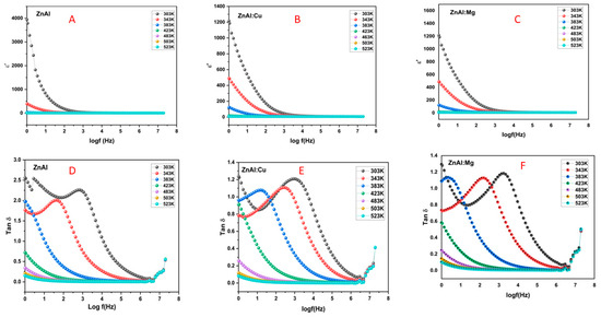 Figure 4D–F represent the tangent loss tan δ of ZnAl, ZnAl:Cu and ZnAl:Mg as a function of frequency ranging from 100 Hz to 20 MHz at temperatures of 303–523 K. The tangent loss is given by