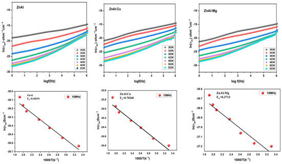 The ac conductivity σac of ZnAl, ZnAl:Cu and ZnAl:Mg as a function of frequency ranging from 100 Hz to 20 MHz at temperatures of 303–523 K is displayed in Figure 5. From the ac conductivity plot, it is seen that as frequency increases, the conductivity also increases at all the given temperatures for all the samples, and the values of conductivity are larger in higher-frequency regions due to the polaron hopping present in sample [8,9]. The frequency- and temperature-dependent conductivity are closely associated with the universal Jonscher’s power law given by the relation
