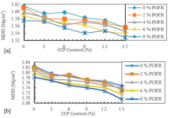 The MDD of the soil materials (RLS and BCS) was studied by blending the proportions of CCP-POFR, as shown in Figure 1. The MDD behavior of both soil materials dropped with the inclusion of varying CCP-POFR contents compared to the virgin soil materials. The MDD of BCS and RLS dropped from their natural values of 1.615 and 1.825 Mg/m3 to 1.528 and 1.695 Mg/m3 at 8% POFR–8% CCP. The documented decrease in MDD might be attributable to POFR and CCP having a low specific gravity of 2.43 and 2.28 compared to BCS and RLS having a higher specific gravity of 2.40 and 2.58, respectively [].