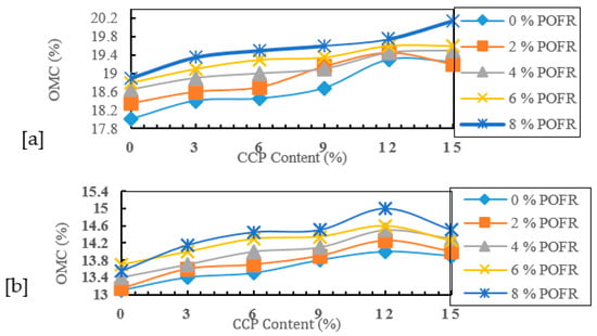 Figure 2 displays the consequences of POFR and CCP on the OMC of BCS and RLS, respectively. The OMC values for mixtures of BCS ranged from 18 to 20.15%, whereas those of RLS mixtures varied from 13.10 to 15%. These values depict an incremental trend in the course of blending the studied soil materials with POFR and CCP. Probably, the cause of this trend of outcome might not be far from the accumulation of fines as well as the pozzolanic interplay instigated by the additive materials. The response of the studied soil materials aligns with the trend reported by [].