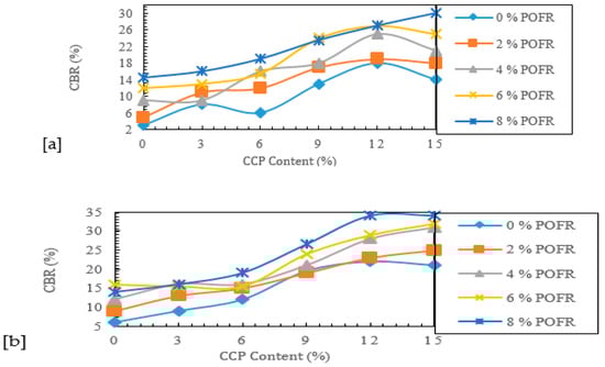 The upshots of the California bearing ratio (CBR) testing of soil BCS and RLS performed under soaked conditions exhibited a substantial percentage increase as the mixtures of POFR-CCP became incorporated (see Figure 3). The soil material understudy had CBR values of 3 and 6% in their unmodified form, and the incorporation of 8% POFR–15% CCP instigated an upsurge of approximately 10 and 6 times their initial values. Remarkably, the CBR values for both additive blended soil materials revealed an inclination pattern, and this could be ascribed to the fact that the finer fractions of POFR and CCP filled up the pores within the soil matrix, which thereby engendered a reduction in plasticity and altered the soil structure as well. This phenomenon is similar to the reports of other investigators who utilized other additives in soil re-engineering [].