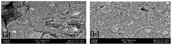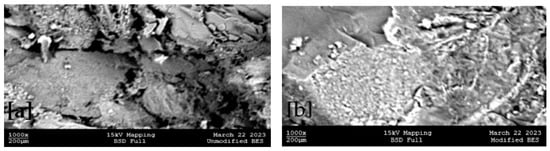 The micrographs of the unmodified soil materials were compared with those of the soil materials modified at 8% POFR–15% CCP to unravel the possible alteration within the microstructural fabric of the soil (see Figure 5 and Figure 6). The unmodified BES displayed a good number of dark-colored cavities, whereas the unmodified RLS was made up of a few broken grain particles, which may possibly be a result of poor linkage performance manifesting in the soil. In the course of incorporating the mixtures of POFR-CCP into the soil materials (BCS and RLS), the morphology was altered (Figure 5b and Figure 6b). The micrograph of both treated soils appears to show the presence of whitish fissures and dense grain structures. The whitish background might be a result of the presence of additive materials, which might as well translate to strength development in the modified samples. In addition, the dense matrix might be linked to the microfilling of the soil matrix by the additive materials. This report is not at variance with other authors who used other solid wastes [].