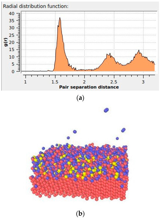 In Figure 4a, it is evident that the deposition transpired as expected. The radial distribution function peak at about 0.16 nm shows that the silica was forming at the surface level. Figure 4b shows the oxygen molecules moving towards the silicon surface and interacting with silicon to form SiO2. Blue-colored molecules are oxygen molecules, and red and yellow denote silicon atoms. four.