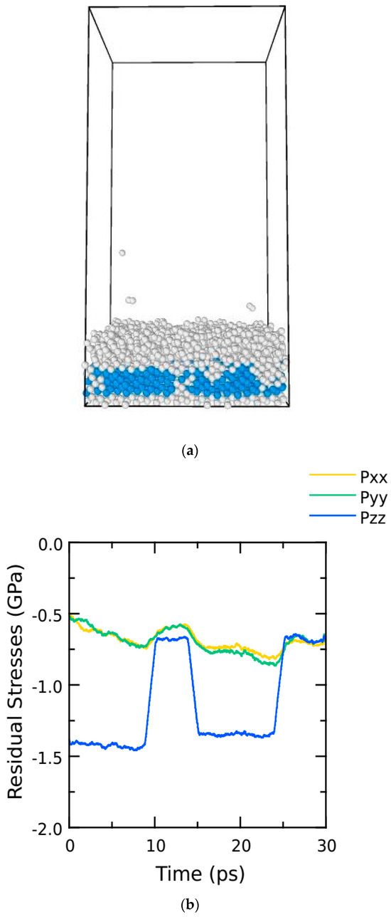 (a) Deposition process visualization using OVITO. (b) Residual stresses generated over one cycle of deposition.
