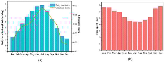 The monthly average irradiation and wind speed at the studied site are depicted in Figure 1a and Figure 1b, respectively. The location receives a yearly total radiation of approximately 1.74 MWh/m2 with an annual average estimated at 4.75 kWh/m2/day and a peak of 7.176 kWh/m2/day in the month of July, while the annual wind speed is estimated at 5.58 m/s with the highest speed marked in December, estimated at 6.84 m/s.