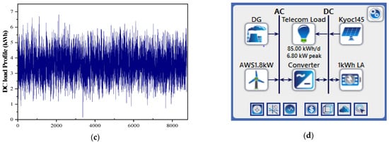 The hourly electric consumption of the studied telecommunication station is shown in Figure 1c. It is a DC primary load with an average consumption of 85 kWh/day.