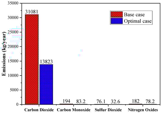 The main aim of this study is to reduce the dependence on DGs and replace them with renewable energy for a cost effective and sustainable power supply. Homer software was able to simulate different configurations with different renewable fractions in order to find the optimal configuration. Table 2 represents the main technical, economic, and environmental findings for each configuration. The base case where only generators are used has the lowest initial capital but a high NPC because of the high operating costs making it an unfavorable solution, especially with the high amounts of CO2 emitted. The other hybrid systems were economically acceptable except for the 100% RES, which has the highest NPC due to the expensive installation cost. The winning configuration is PV–wind–DG–battery with an NPC of USD 85673 and a COE of USD 0.214 with a total electric production of 34,879 kWh/year, in which PV contributes 17.7% of the total production, 38.6% by WTs, and 43.7% by DGs. The fuel consumption was decreased to more than half that of the base case. The optimal size of the different simulated configurations is represented in Table 3. It can be seen that the diesel capacity in the DG-combined configurations was reduced to half compared to the base case. The optimal size of the winning configuration was 3.81 kW of PV capacity, three wind turbines, 14 battery banks, and a 6.10 kW converter. Figure 2 shows how the pollutant emissions were considerably reduced in the optimal hybrid renewable energy system compared to the conventional one making it an environmentally friendly option. CO2 emissions were reduced from 31,081 kg/year to 13,328 kg/year, which is the lowest amount among the other DG-combined renewable systems.