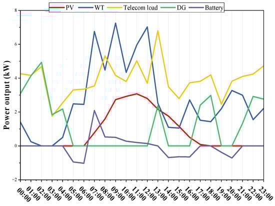 The control strategy used in this study is the load-following strategy; this dispatch strategy is suitable for systems with high renewable penetration. The hourly energy management for a representative day is clearly shown in Figure 3. The DC load is primarily supplied by the electricity produced from PV and wind turbines. The surplus is stored in batteries once there is an excess of power production. Whenever the renewable electricity produced is not enough to meet the load demand, the battery discharges to meet the deficiency. If the battery reaches its minimum state of charge, then the diesel generator operates to generate enough power output to meet the load.