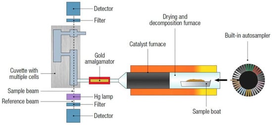 A direct mercury analyser (DMA) is an instrument designed to measure the concentration of mercury as shown in Figure 1, specifically in solid and liquid samples, without the need for complicated sample preparation. The technique offers a rapid and simple method for the determination of mercury in alternative solid fuels []. Taking into consideration that mercury is a toxic element, various methods have been developed to detect and quantify mercury in different samples. One of the classic and widely used methods for mercury determination is cold vapor atomic absorption spectrometry (CVAAS).