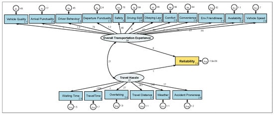 SEM (Structural Equation Modeling) was implemented to develop the structural relationship between observed and latent variables. This method combines confirmatory factor analysis and path analysis with appropriateness for determining latent constructs from observed questionnaire variables and assessment of the association between unobserved and target variables. SEM, however, performs well when the sample size exceeds 200 [12]. A general rule of thumb is that the ratio of sample size to the number of observed parameters might range from 5 to 1 [13] to 20 to 1 [14]. Considered sample sizes for each model satisfied all the above requirements. The model consists of 20 observed variables and 2 latent variables and, among the 20 observed variables, reliability is considered to be the target variable. The observed variables are vehicle quality, arrival punctuality, driving behavior, departure punctuality, safety, driving skill, obeying of law, comfort, convenience, environment friendliness, vehicle speed, availability, travel cost, waiting time, travel time, overtaking, travel distance, accident proneness, and weather. The two latent variables are overall transportation experience and travel hassle. Principal Component Analysis was carried out with VARIMAX rotation using SPSS 16.0 package. After the factor analysis, insignificant precursor for determining reliability of bus modes “Travel Cost” was eliminated. It may be because of the very lower rate of cost for students in both institutional and public bus services. Additionally, institutional buses receive subsidies from either educational institutions or the government. Therefore, it was proved as an insignificant precursor for determining reliability of bus modes.