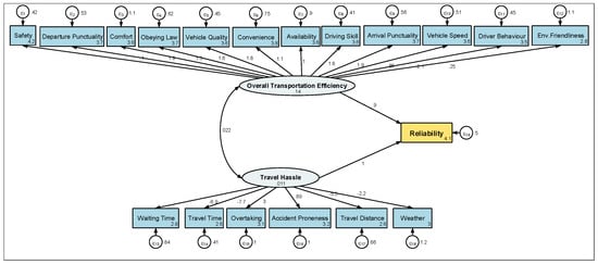 In the models of public buses (Figure 1, Table 3) and institutional buses (Figure 2, Table 4), latent variable travel hassle impacts reliability more than transportation experience. Overtaking (Coeff. 0.272, Table 3) and accident proneness (Coeff. 0.167, Table 3) were the influencing precursors of travel hassle impacting reliability in the model for public buses. Less accident proneness and overtaking tendency enhance the reliability of using bus services. In Bangladesh, bus accidents are severe where there are lack of police control and median [16]. In terms of the lack of law enforcement, accident probability increases, and overtaking, speeding also appear in road networks, resulting in the loss of reliability. Arrival punctuality (Coeff. 1.304), departure punctuality (Coeff. 1.214), and vehicle quality (Coeff. 1.000) were the top three (Table 3) striking factors of reliability under the latent variable “overall transportation experience”. Punctuality is seen as an important factor in student life and reliability perception is increased among them if the transportation service is punctual. Students are also more concerned about the vehicle quality of public buses for better perception and consciousness.