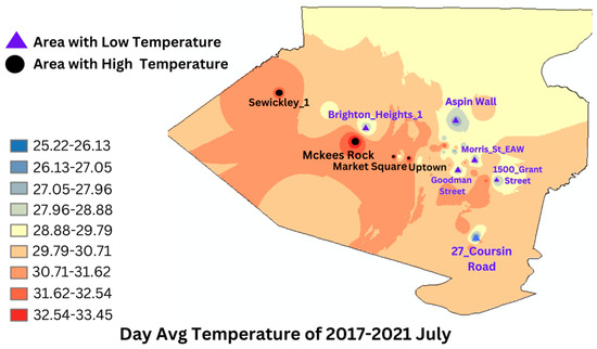 By analyzing data from five years, the temperature was highest in Mckees Rock (33.47 °C) and lowest in 27 Coursin Road (25.2 °C). Beside that, the surface temperature was massively high in Sewickly_1, Market Square, and Uptown. From the map, we can observe that the day temperature was low in Brighton Heights, Aspinwall, Morris St EAW, 1500 Grant Street, and Goodman Street.