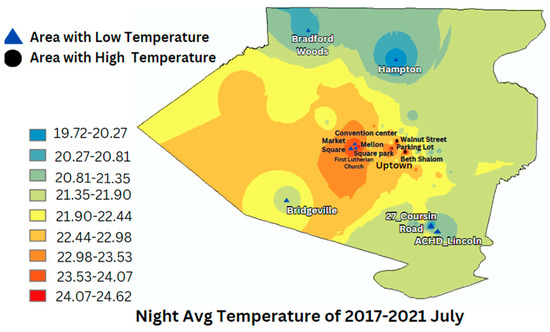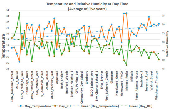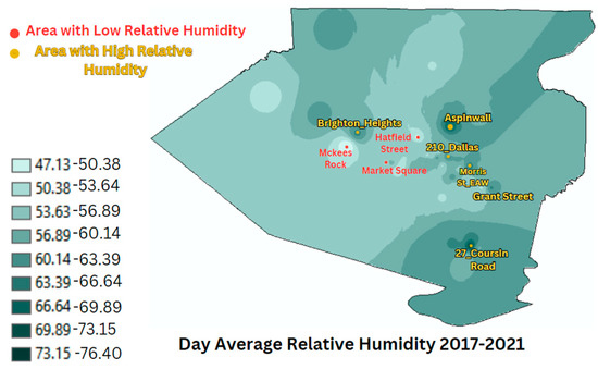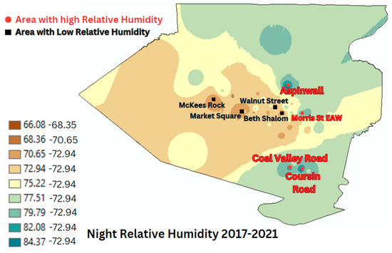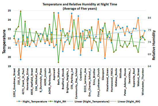 The plots are drawn to indicate average temperature and relative humidity data for five years’ timespan. Separate plots are drawn for day and night. Though there is no definite relation between temperature and relative humidity, for most of the locations high relative humidity corresponds to low temperature. On the contrary, low relative humidity corresponds to high temperature. This is why the trendline for relative humidity has gone downwards and the trendline for temperature has gone upwards. Spatial variability such as geologic position, land use topographic condition, and terrain exposure such as solar exposure, wind exposure, terrain roughness, slope exposure, and hydrologic exposure are probable factors that influence the absolute and relative humidity, and those factors are also related to temperature. The outliers of the trendlines are 27 Coursin Raod with high daytime relative humidity and 4935 Hatfield Street, Market Square, and Mckees Rocks with very low daytime relative humidity. Excessive temperature has been observed in Alison Barth which is 32.6 °C Market Square which is 33.45 °C and in Mckees Rocks which is 33.47 °C. Some other anomalies detected in the trendline are 27 Coursin_Road (86.68%) and Aspinwall (86.05%) which show higher relative humidity than other points and Beth Shalom (65.61%) which displays excessively low relative humidity at night. For timespan 2017–2021, relation of average relative humidity with average day temperature and relation of average relative humidity with average night temperature are depicted in Figure 5 and Figure 6.
