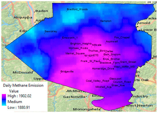 From Figure 7, it can be observed that methane emission is comparatively less in Franklin Park, Pine and McCandless, and West Alleghany, whereas methane concentration is high at Pittsburgh, Baldwin Whitehall, and Brentwood Borough SD. As for the rest of the areas in Alleghany County, methane emission is at a moderate level.