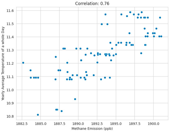 The scatterplot displays a connection between two variables, the yearly average temperature and daily methane emission (in ppb) of the same place. The Pearson correlation coefficient is used to show the strength and direction of the linear relationship of these two variables. The correlation of yearly temperature with methane emission is displayed in Figure 8.