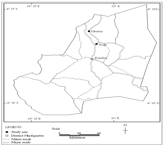This study was conducted in 2017 in two villages within the Kondoa district found in the Dodoma Region in central Tanzania (Figure 1). The district is between latitudes 4°12′ and 5°38′ south and longitudes 35°6′ and 36°2′ east of Greenwich [7,9]. Kondoa District shares borders with Babati in the north, Kiteto District in the east, Manyoni District in the southwest, Singida District in the west, and Hanang District in the northwest [10]. The district was considered because it is endowed with a natural forest and is among the districts where REDD (Reducing Emissions from Deforestation and Forest Degradation) pilot projects were implemented in the country. Thus, the contribution of NTFP to food security could be easily assessed. The district has a total area of 13,210 square kilometers, of which 50.5% is suitable for agriculture, 25.5% is under natural pasture, 16% is forest reserve, and the remaining 8% comprises urban areas and water swamps [11].