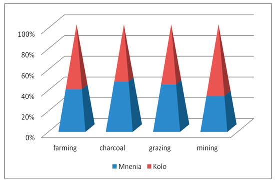 Apart from the availability of the by-laws, which allowed the community to harvest some of the NTFPs, different human activities were restricted in the area. Figure 2 shows that 64% and 42% of farming activities in Kolo and Mnenia villages, respectively, were followed by 32% and 28% of charcoal-making in the same villages. Also, Mnenia village had 14% and 4% of grazing and mining, respectively, followed by Kolo village, which had 11% and 2% of grazing and mining, respectively.