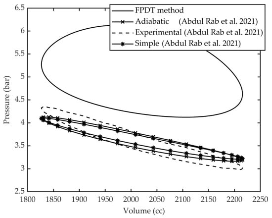 For model validation and a detailed analysis of the FPDT model, a p-V diagram is shown below which describes the performance of the Stirling engine. Furthermore, Table 1 shows a summary of thermodynamic model in which the work, power, and efficiency of the FPDT model are compared with a simple model, an adiabatic model, and experimental data. The Figure 1 shows the comparison of FPDT thermal model with other thermodynamic model. The indicated work of the FPDT model is 10.7 J, while the experimental value determined by Abdul Rab et al. [] is 7.50 J, which is 41% more than the experimental estimated value. The average pressure of the engine is 3.58 bar, but the value estimated using this method is 4.75 bar, and the peaks value of the p-V diagram curve are also greater than the estimated values.
