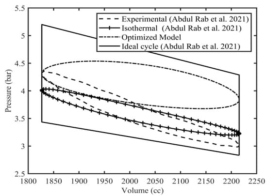 The p-V is drawn in Figure 1 for the validation results and compared with the literature results []. While Table 2 shows the summary of thermodynamic models and a comparison of results with the optimized model, Table 3 depicts the optimized parameters obtained through the genetic algorithm. The results show that the power obtained through genetic algorithms is closely related to the experimental results. The experimental power is obtained at 111.43 W [] and the optimized power at 113.04.