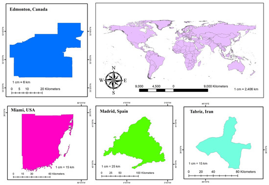 The cities investigated represent the four main climate types of A (tropical), B (dry), C (temperate), and D (continental) Figure 1 shows the study area. The initial city under scrutiny is Tabriz, situated in the northwestern region of Iran. Tabriz experiences a cold semi-arid climate (classified as B). Its geographical coordinates are 38°5′ N latitude and 46°16′ E longitude. The second city investigated is Miami, a coastal city located in southern Florida, United States, that represents a tropical monsoon climate (classified as A). Miami’s geographical coordinates are 25°45′ N latitude and 80°11′ W longitude. Next, Edmonton exemplifies a humid continental climate (classified as D). Edmonton’s geographical coordinates are 53°32′ N latitude and 113°29′ W longitude. Lastly, Madrid, situated in the heart of Spain, represents a Mediterranean climate (classified as C). Madrid’s geographical coordinates are 40°25′ N latitude and 3°42′ W longitude.