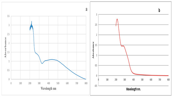 The technique of ultraviolet-visible spectroscopy is often employed to describe nanoparticles. The recognizable absorption in the visible range is caused by the metallic nanoparticles’ surface plasmon resonance. Utilizing the 200–800 nm UV-visible spectrum, the absorbed energy of NPs was calculated. The absorbance at 432 and 218 nm, which is specific to silver and iron oxide nanoparticles, was observed, as can be seen in Figure 1a and relates to previous literature [12,13]. In an aqueous solution, silver and iron oxide nanoparticles have a brownish-yellow and red hue.