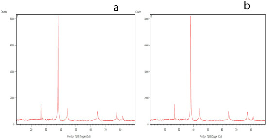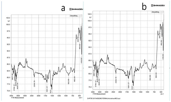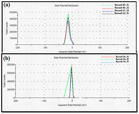 The zeta potential was determined in order to explore the solution’s colloidal stability. The term “zeta potential” refers to the electric potential of the particles at the double layer’s interface. The microscopic particles are stable due to the surface charge covering them, which also inhibits agglomeration. According to Figure 4a,b, NPs have a zeta potential of −23.36, and −27.06 mV, correspondingly. This reading demonstrates the NPs’ stability.