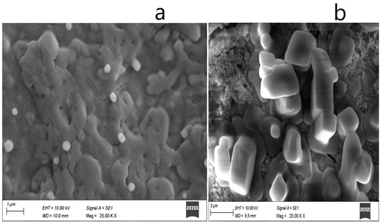 Using the electron micrograph of the complex as a starting point, the SEM was able to examine the skeletal anatomy of the synthesized AgNPs and FeONPs. The NPs’ predominant shape was demonstrated to be spherical and cubic. According to the study, SEM photos demonstrated the spherical shape and size of the AgNPs produced by Leucas cehalotes, which were in the a wavelength ranging from 10 to 100 nm [15]. A similar outcome for AgNPs was reported according to Figure 4a, Figure 5a and Figure 6a, which depicted a 2 m with a magnification of 20 KX using Figure 4b, Figure 5b and Figure 6b, which depict the 1 m with 25.000 KX magnification. Imaging at higher magnifications was performed using FESEM. As indicated in Figure 4a,b, iron oxide nanoparticles made with Ajuga macrosperma leaf extract had a cube form and a selection of sizes of 5–27 nm. Similar results have previously been reported [16].