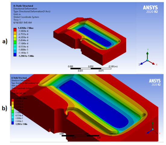 The Huber–Mises stresses are the highest around the center of the load application zones, as depicted by the contours in Figure 3. It is crucial to remember that this is an equivalent stress, which is determined using the major stresses, even though the contour may not show distinct gradients of results. The correlations among the primary stresses may give rise to outcomes with non-trivial contours, like the one in question. The Bulk model’s graphical findings are displayed in Figure 4. In terms of displacement along the y axis, refer to Figure 3a and Figure 4a for the coordinate system. The results are displayed in Figure 4a. Figure 4b is a larger version of Figure 4a. As would be predicted, the contour of Figure 4 displays substantial vertical deflections where the load is applied. The distance to the locations of load application results in a deflection gradient.