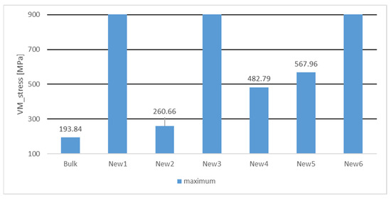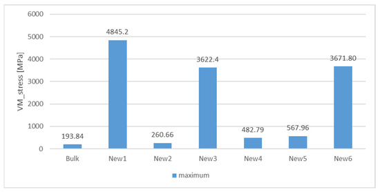 According to the findings presented in Figure 5 and Figure 6, it can be inferred that the existing configurations of the New1 and New2 geometries are deemed impracticable due to the inability of any steel material to endure the excessive stress levels associated with them. The Bulk, New2, New4, and New5 satisfy the specified criteria for structural yield strength, which is set at 700 MPa. The structural analysis reveals that the Bulk, New2, and New4 geometries exhibit a satisfactory performance, as they can withstand a stress level of 500 MPa. At a yield strength of 300 MPa, only the Bulk and the geometry New2 demonstrate a maximum von Mises strength below the yield point. Figure 7 illustrates the maximum displacements in the y direction for each respective shape.