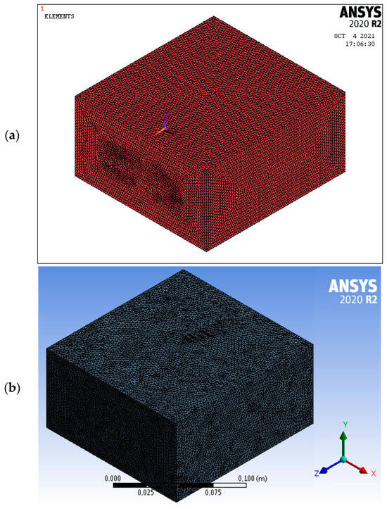 The mesh employed in this study is a quadrilateral-free mesh. Despite the fact that both modules utilized identical mesh parameters, there is a notable disparity in the overall quantity of mesh pieces between Workbench and Mechanical APDL. The mesh seen in Figure 2a,b was generated utilizing Mechanical APDL and Workbench software, respectively.