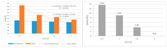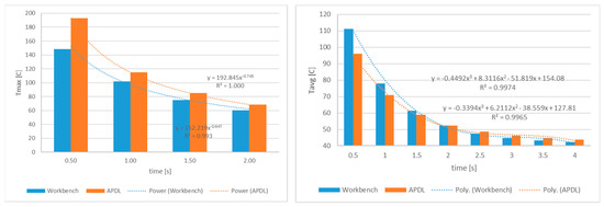 In Figure 4 (left), it can be observed that Mechanical APDL outperforms Workbench in the majority of scenarios. However, the discrepancies between the two software components diminish with time. As shown in Figure 4 (right), the inaccuracy as a function of time corresponds to an exponential function for the average temperature Tavg and a third-degree polynomial function for the highest temperature Tmax. As seen in Figure 4 (left), the quadratic correlation is quite close to one. As seen in Figure 3 and Figure 4, the temperature distribution differs between the two software modules for all of the studied substeps. However, the temperature measurements in ANSYS Mechanical APDL and ANSYS Workbench are likely to be close. The temperature distribution clearly agrees better for t = 2 s than for t = 4 s and t = 2 s.