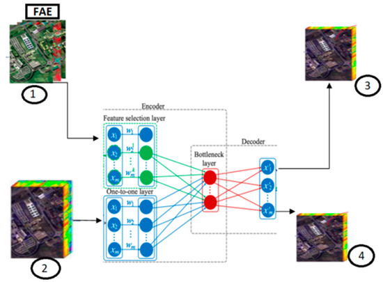 The architecture of FAE. The presented quantifies are (1) feature selection result, (2) input, (3) reconstruction based on the selected features, (4) reconstruction from the one-to-one layer.