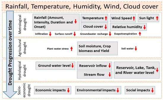 A protracted period of below-average precipitation causes water deficits in the atmosphere and is the hallmark of a “meteorological drought”. When there is not enough soil moisture to meet the needs of crops, an “agricultural drought” occurs, which lowers agricultural productivity. A “hydrological drought” affects the amount of water in rivers and aquifers by reducing streamflow, groundwater levels, or reservoir storage. The term “socioeconomic drought” refers to how water scarcity affects human endeavors including industry, urbanization, and water delivery. The term “ecological drought” describes how a lack of water affects ecosystem services, biodiversity, and habitats [2,3].