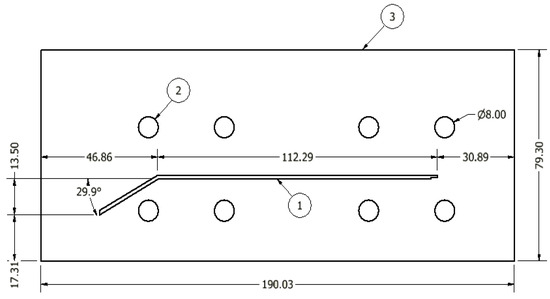 The CAD model used in this project was generated by the combined utilization of ANSYS Workbench 2020 R2 and ANSYS Mechanical APDL 2020 R2. The three-dimensional architecture comprises eight cooling channels, visually represented as circles; a mold cavity, drawn as a rectangle; and the part itself, represented by a curved plate. The assembly is illustrated in Figure 1. Table 1 presents a comprehensive overview of the fundamental components of geometry.